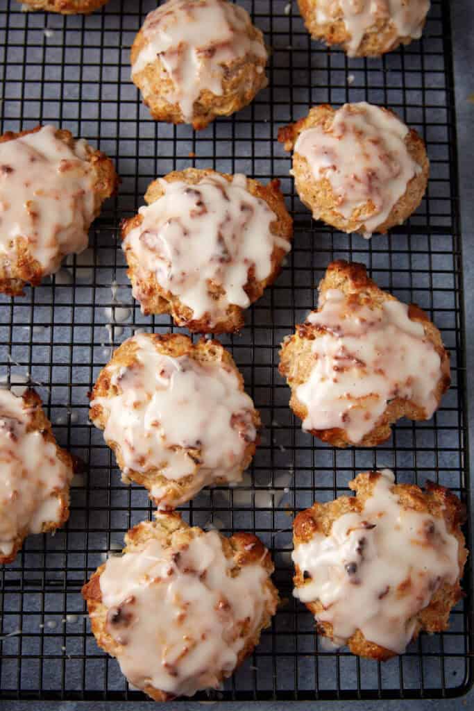Once they’re baked (and looking a little rustic, which is what we want), they get glazed twice. First, a thinner glaze that gets broiled, yep, broiled, to crisp up and caramelize a bit. Then a thicker glaze to finish it off once they cool slightly. It’s a double dip situation and it works.