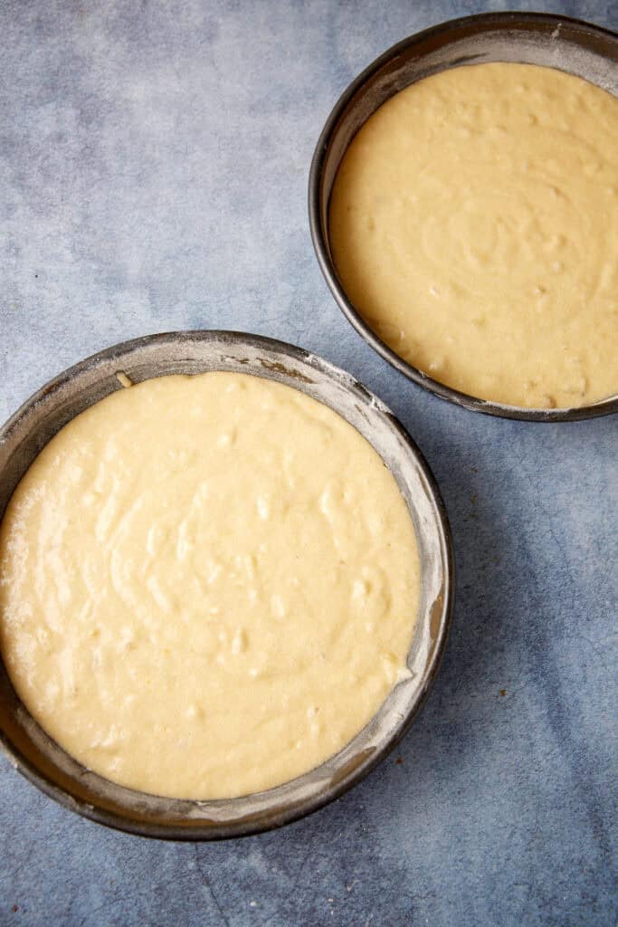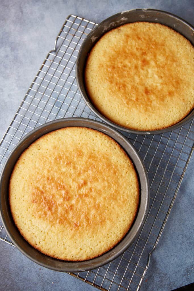 - Divide the batter between the two cake pans and bake for 33-35 minutes until a toothpick comes out clean. Cool in the pans on a rack for 15 minutes. Use an offset spatula to loosen the edges and turn onto a wire rack. Let cool completely.