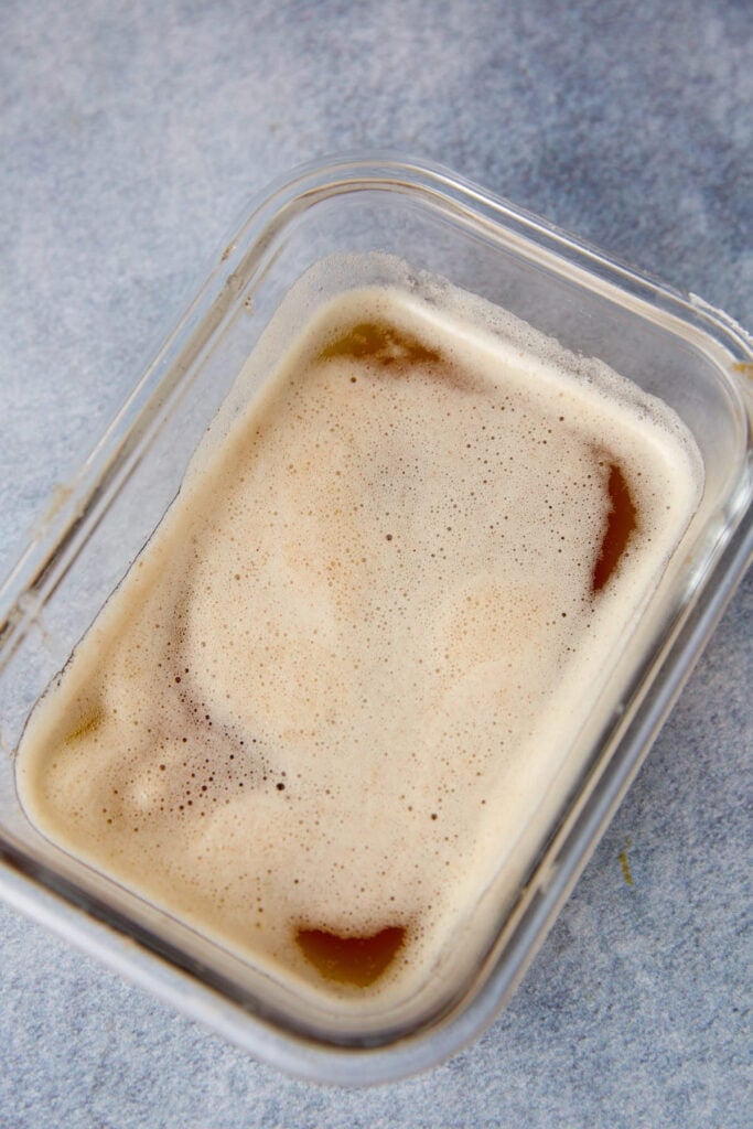 - Add the butter to a light colored saucepan and melt over medium-high heat, whisking occasionally. It will first melt then foam up. Once it begins to brown, watch it very closely then remove once it has turned an amber color and immediately remove from the saucepan to a glass bowl or measuring cup. Refrigerate until slightly solid.