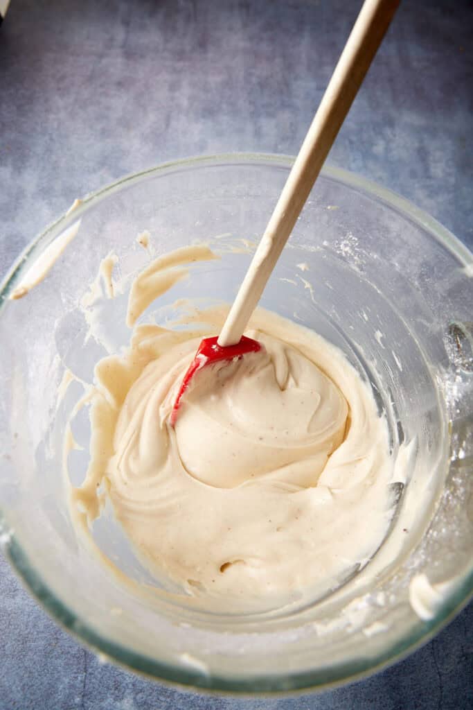 - In the bowl of an electric mixer, add the solid browned butter that is slightly soft and cream cheese and beat on high speed until creamy and smooth. Add vanilla and salt and mix to combine. Gradually add the powdered sugar and beat on low speed so that it doesn’t fly out of the bowl. Once incorporated, beat on high until smooth and creamy.