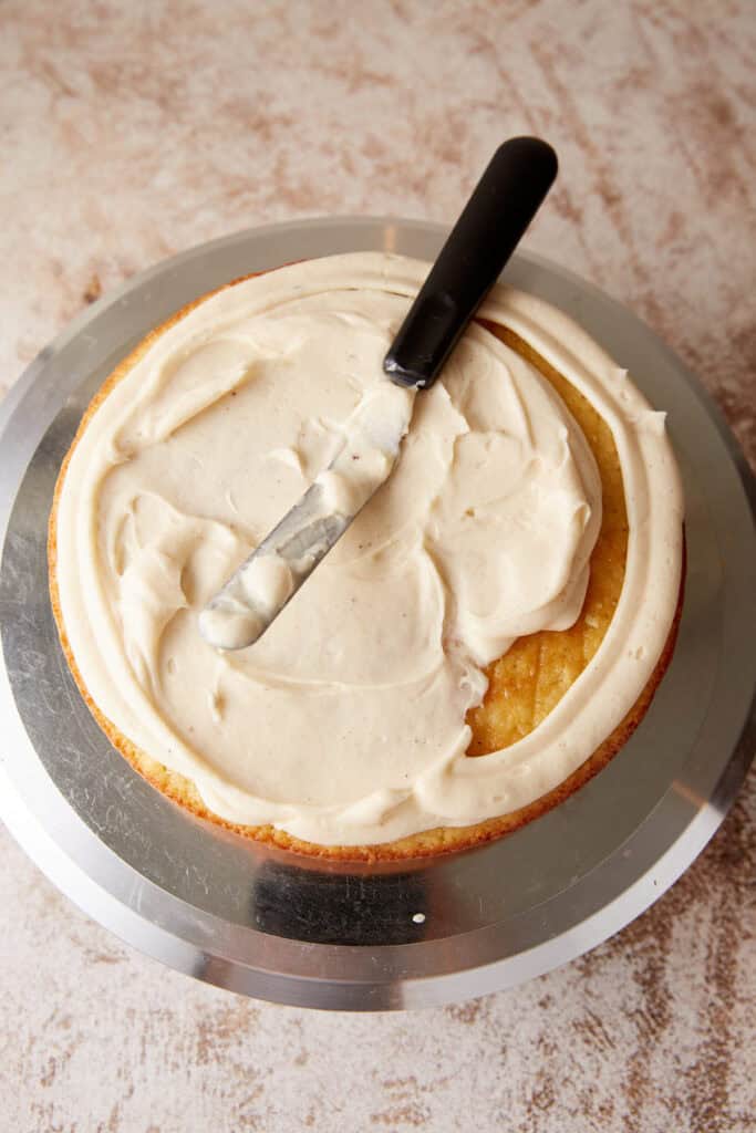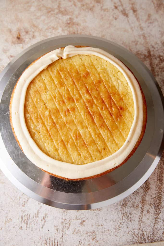- Place 1 layer on a cake plate and even the top with a serrated knife if needed. Pipe a ridge of frosting around the outside of the top and then fill in with more frosting. Even out the second cake layer with a serrated knife and flip it so that the bottom of the cake layer is facing up. Place most of the frosting on top and use an offset spatula to spread it down the sides. Once the sides are covered, spread it evenly across the top.