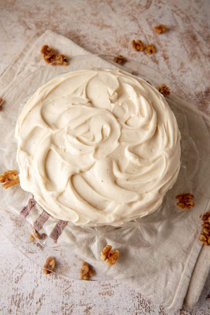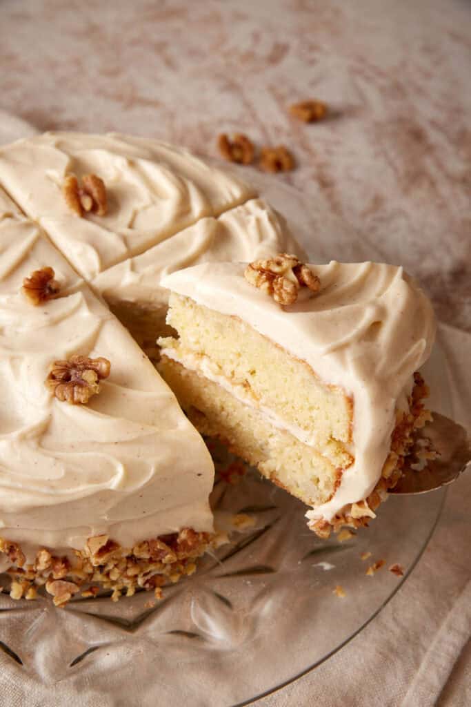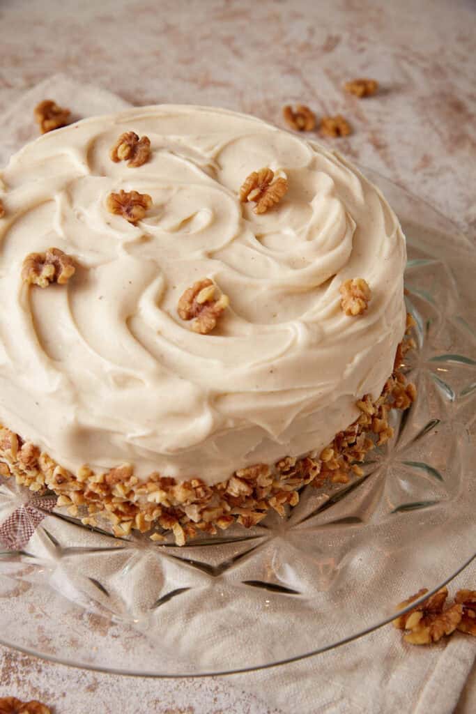 - Press the toasted walnuts up the side of the cake. Let refrigerate until the frosting sets to make it easier to slice.