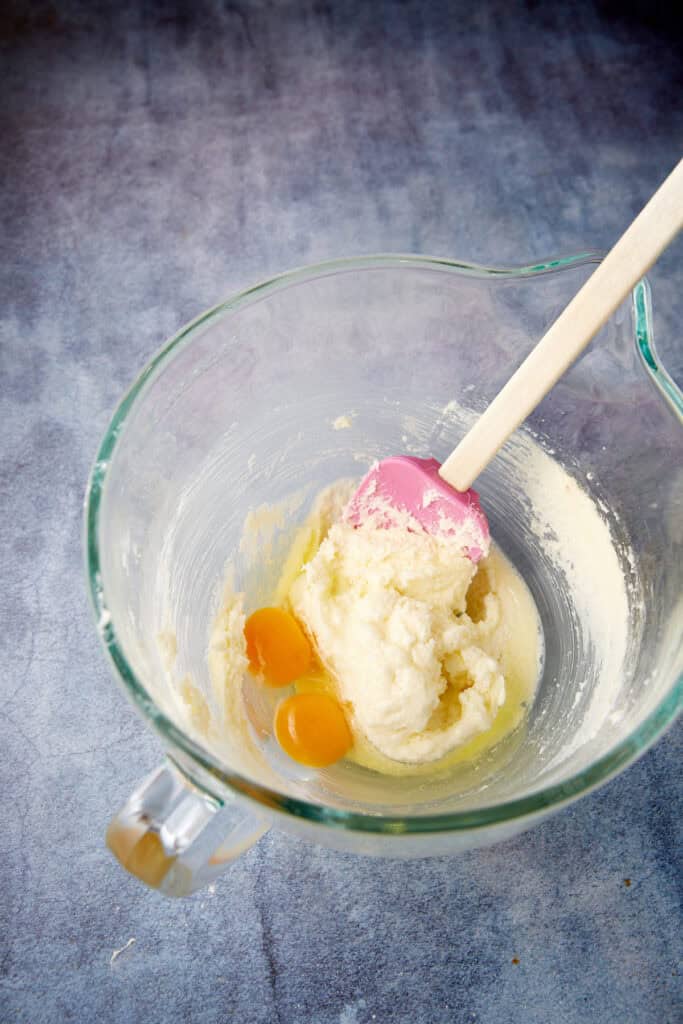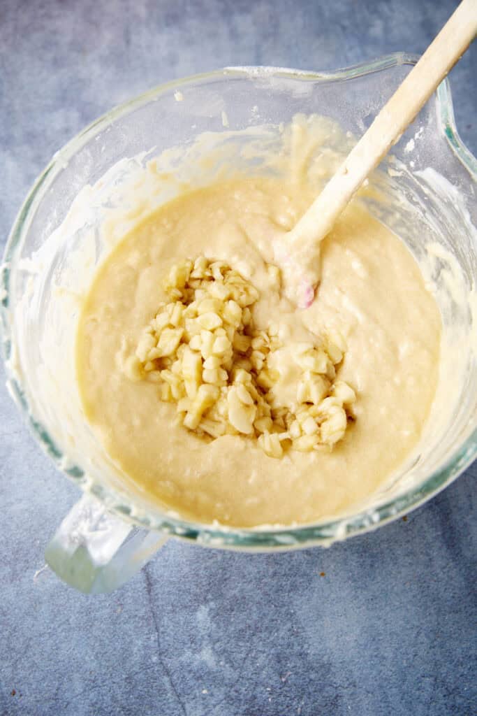 - In a separate bowl beat 4 eggs with 1 ½ cups sugar until it is thick and a pale yellow, about 2-3 minutes. Fold the egg mixture into the batter. Fold chopped bananas into the batter. The batter will be lumpy