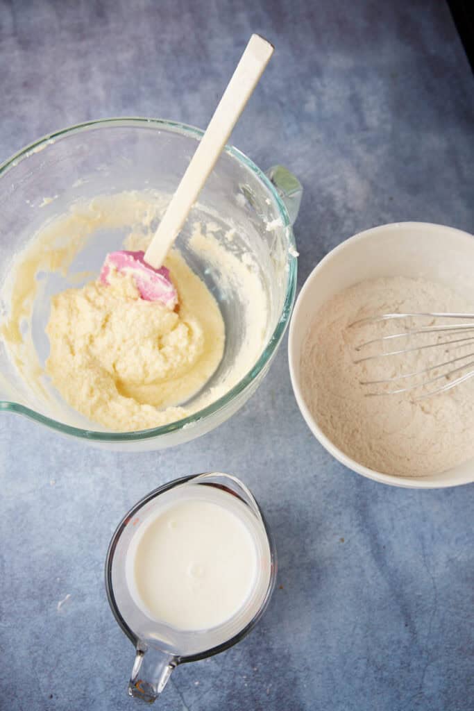 - In the bowl of an electric mixer, beat the butter and 1 cup of sugar until light and fluffy, about 3 minutes. Add 2 eggs, beating until combined. Add dry ingredients alternating with buttermilk.
