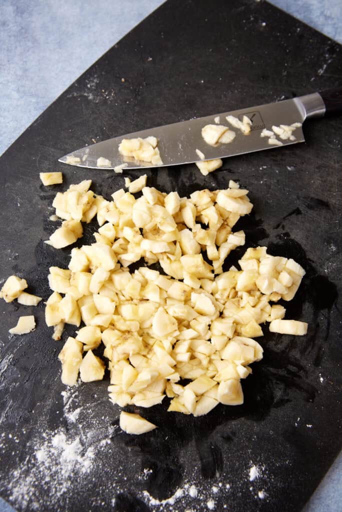 You will use chopped, not mashed, bananas so you want to find bananas that are ripe but not overly ripe. I love the texture the little chunks of banana give to the cake.