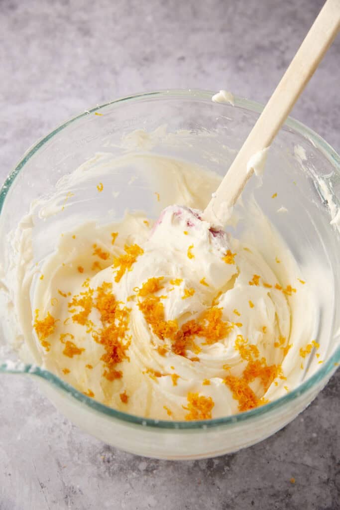 This frosting comes together in 5 minutes and is just as simple as making cream cheese frosting from scratch. It starts with a butter and cream cheese base, followed by powdered sugar, then orange zest, vanilla, and finally, fresh blackberries.