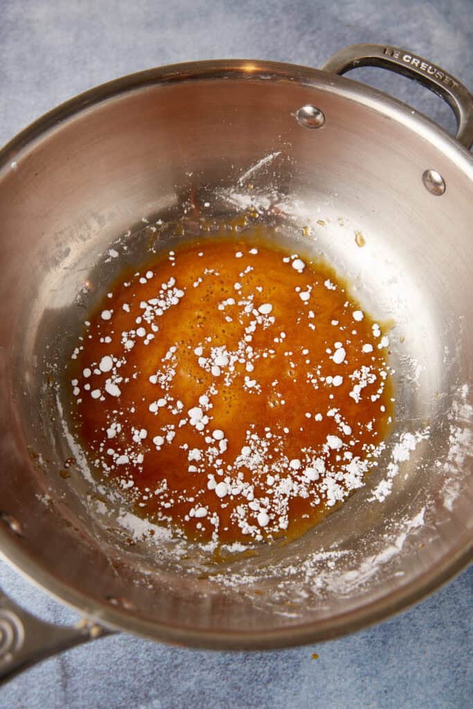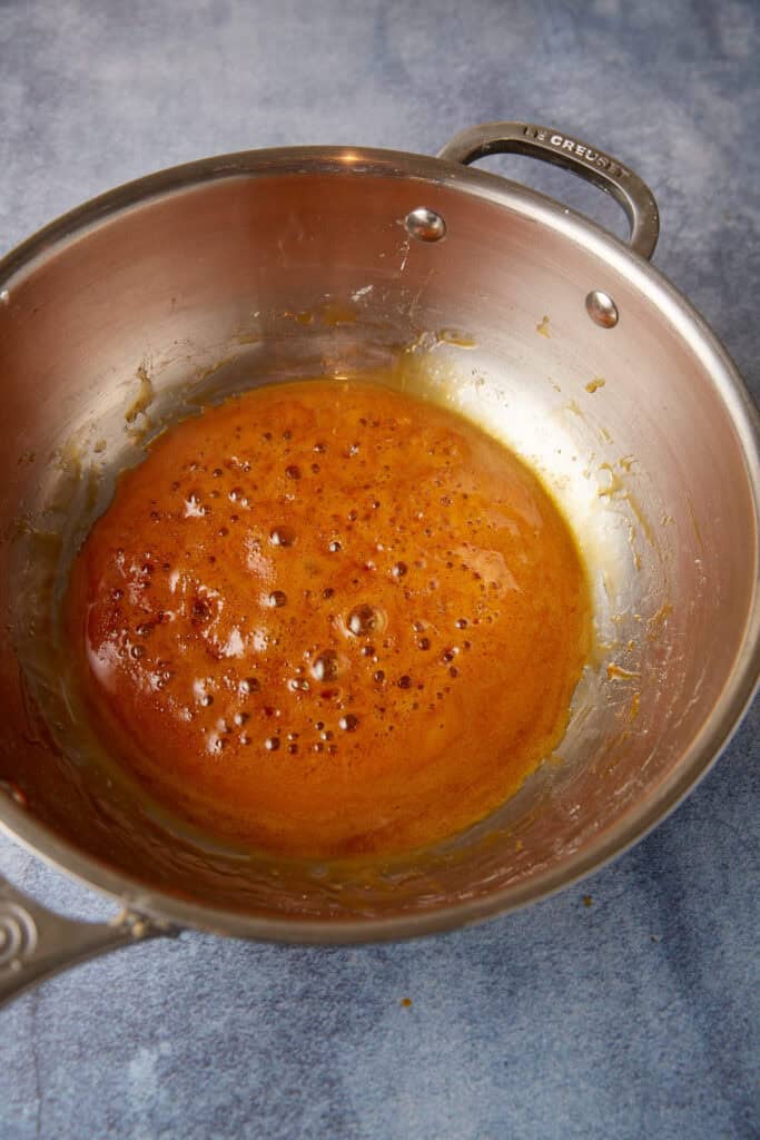 - Continue cooking, about a minute, stirring to make sure the sugar has dissolved until it is a medium amber color. Don’t let it get too dark or it will taste burnt.