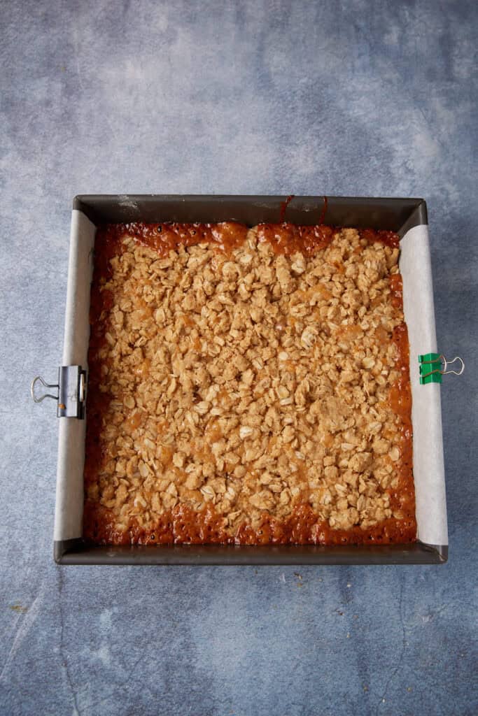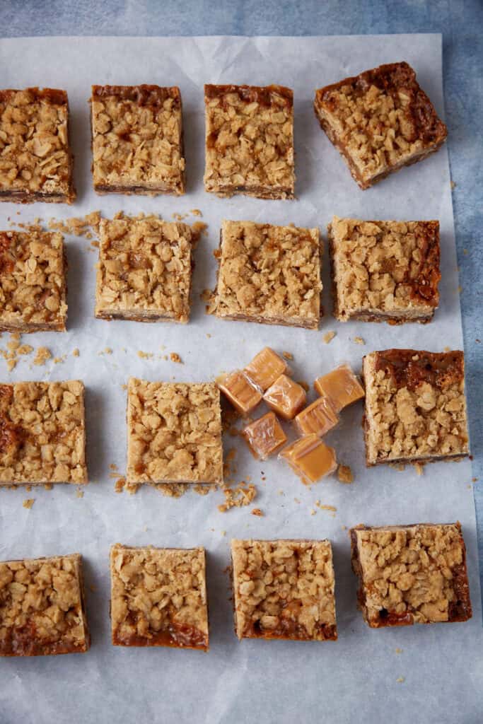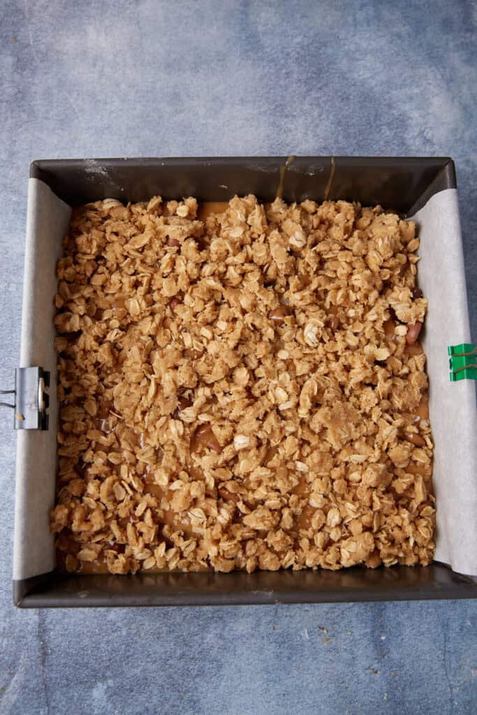 Top the baked oat layer with chocolate chips and pour the caramel sauce over it. Sprinkle with sea salt and crumble the rest of the oat mixture on top. Bake in the oven again until golden and bubbly.