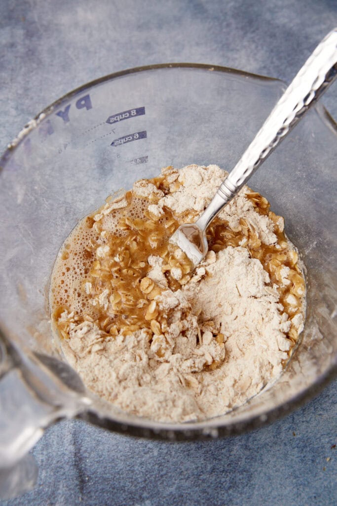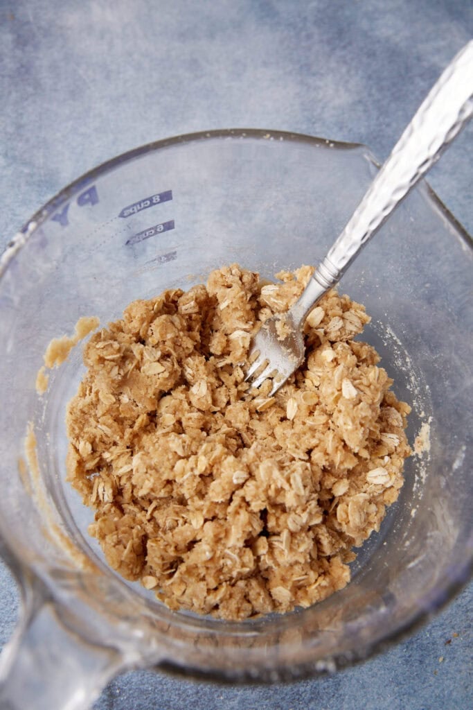 - In a medium bowl, mix together the flour, oats, brown sugar, baking soda and salt. Pour the brown butter over the dry mixture, stirring with a fork until it is combined.