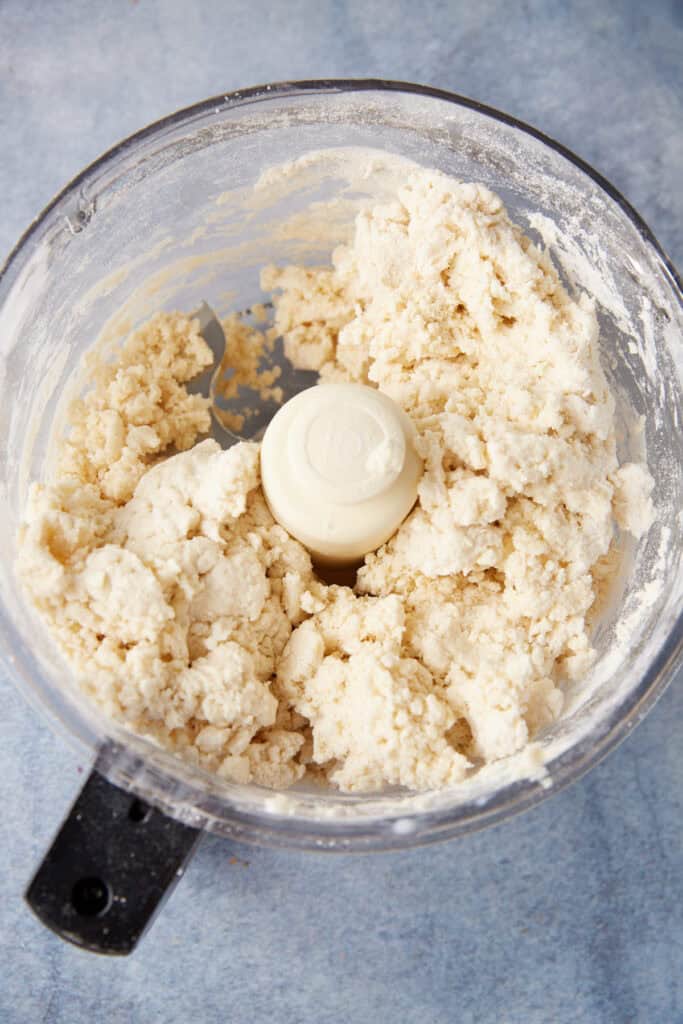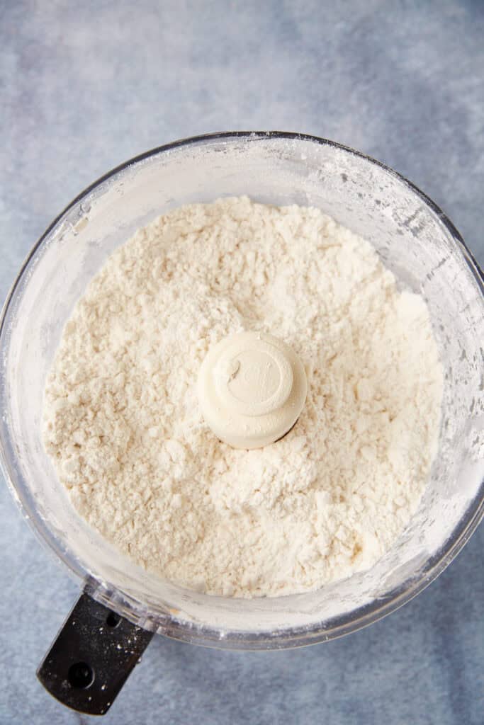 - Add flour, baking powder, baking soda, salt and sugar to a food processor and process to combine. Add cold butter and process until it resembles coarse meal with chunks of butter the size of peas.