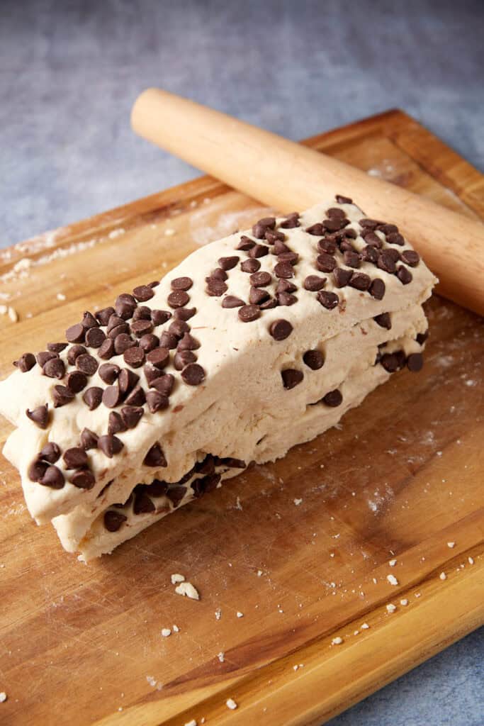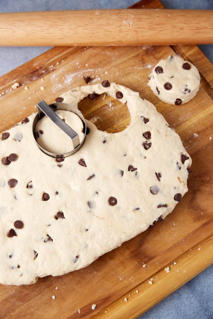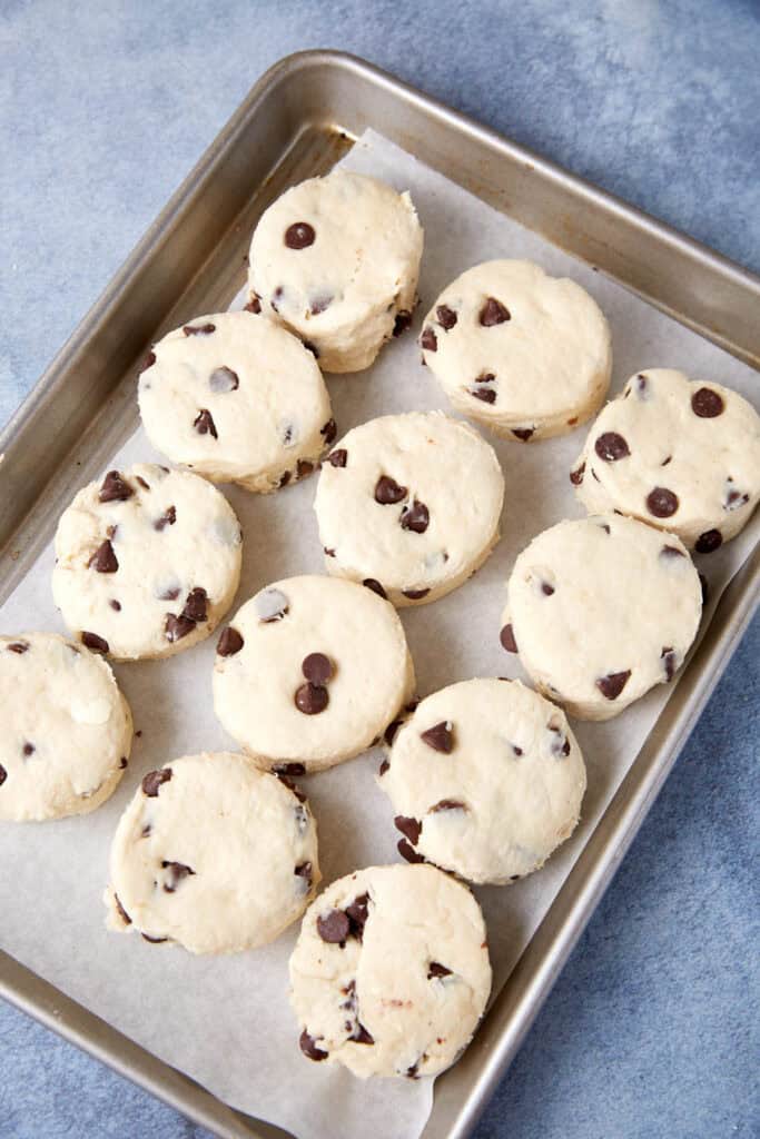 Roll out the dough on a floured surface, sprinkle with chocolate chips, and press them in. Cut the dough into sections and stack them. Roll out and repeat. This will give you tall and flaky biscuits.