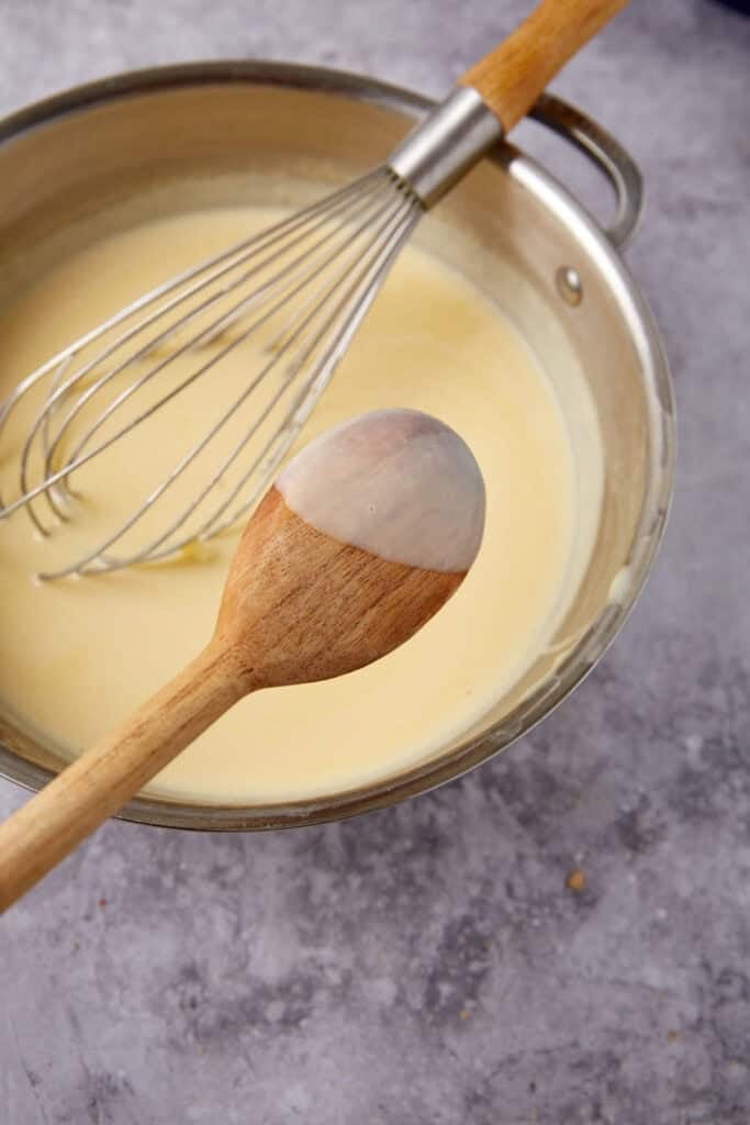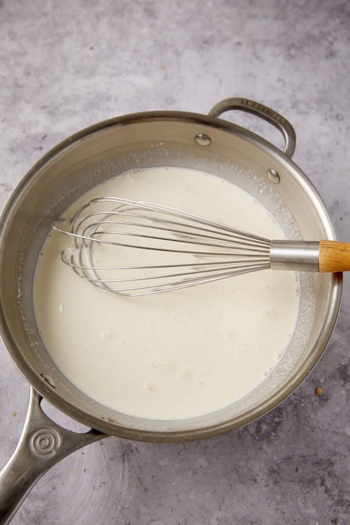 - Add milk, cream, sugars and salt to a saucepan over medium-low heat. Bring to a simmer and remove from the heat.
