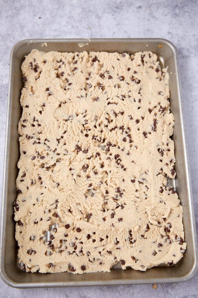 - Combine butter and sugars in a stand mixer and mix until light and fluffy. Add milk, vanilla and salt and mix to combine. Add flour and salt and mix until combined, add chocolate chips. Spread the dough into a rimmed baking sheet and freeze. Once hardened, remove and cut into bite sized chunks. Keep frozen until ready to use.