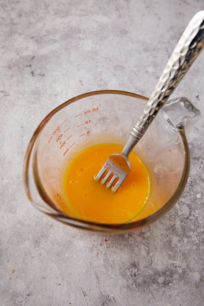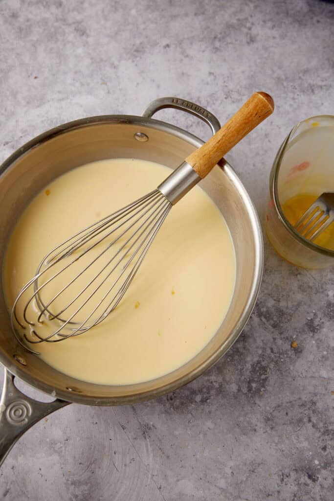 - Whisk the egg yolks together in a large measuring cup or bowl. Gradually add 1 tablespoon of the hot milk mixture to the egg yolks, whisking until combined. Continue slowly adding the warm milk until the egg mixture is warm. Then slowly add the warm eggs to the hot milk, whisking constantly until incorporated.