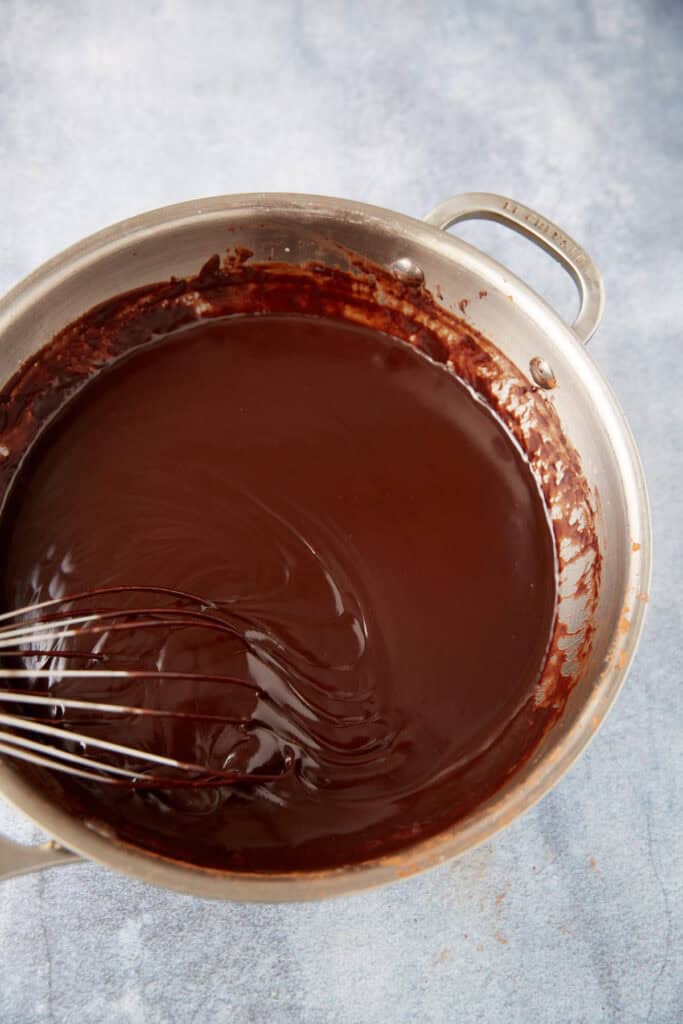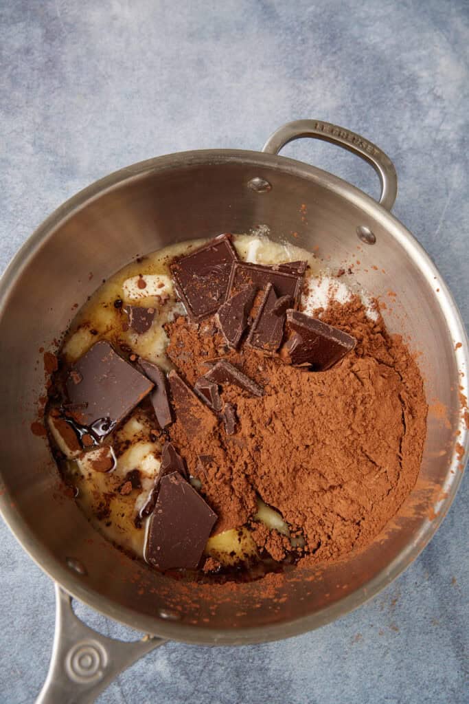 - Add butter, sugar, salt, cocoa powder and chocolate to a saucepan over medium heat. Cook until it begins to bubble around the edges but does not boil, about 3-4 minutes.