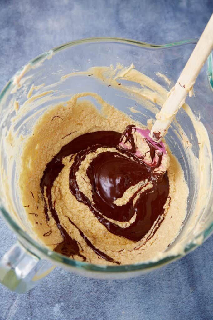 Cream butter and sugar in a stand mixer until smooth, then add eggs and melted chocolate. Alternate mixing in the dry ingredients and the milk mixture until the batter is silky.