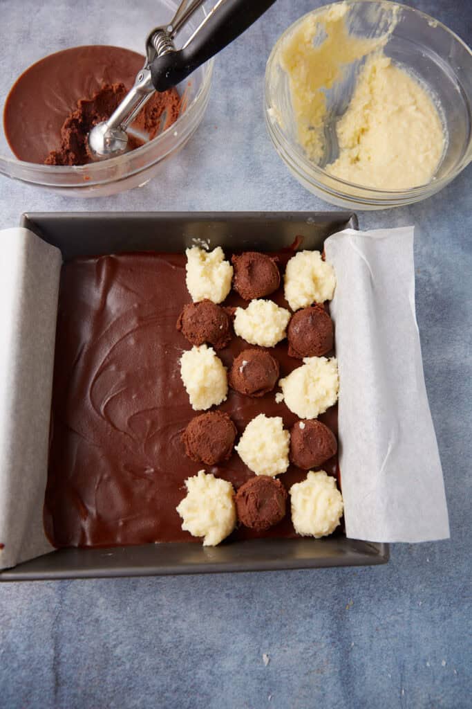 - Alternate adding a tablespoon of chocolate batter and a tablespoon of coconut batter to the pan with the brownie layer. The chocolate batter will be thicker than the coconut batter. Take the remaining 1/3 cup of loose coconut and press it on top of the coconut batter.