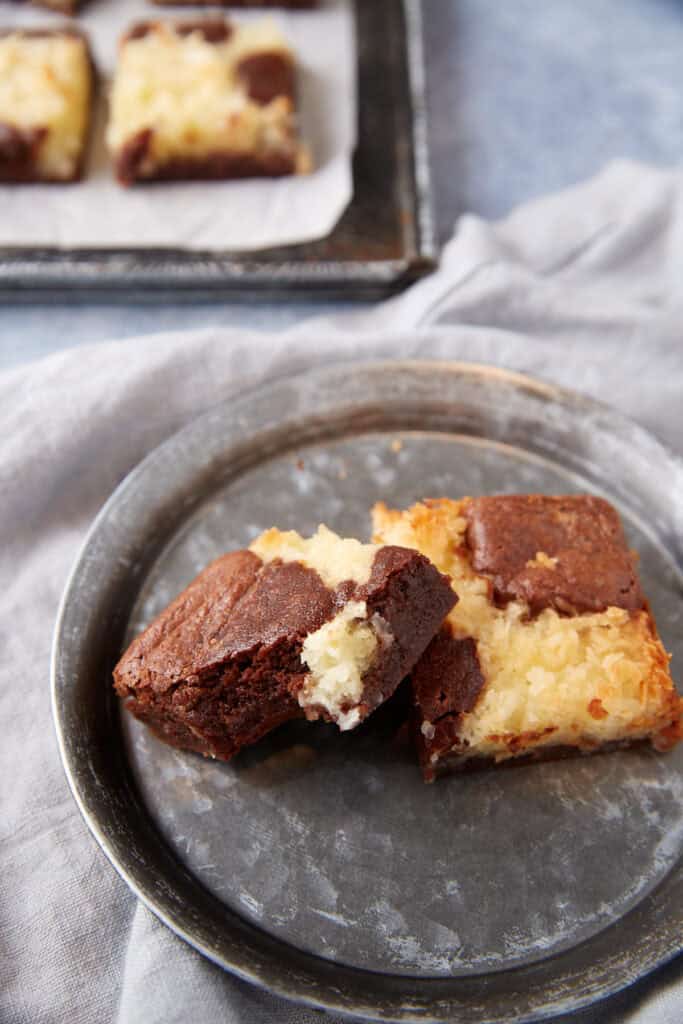 These Coconut Brownies are a decadent treat reminiscent of a Mounds candy bar. You have a layer of fudgy chocolate topped with dollops of a gooey coconut filling and more fudgy brownie, all baked to perfection in the oven. The rich brownie base is perfectly dense, and the alternating chocolate and coconut mixture make a fun design.