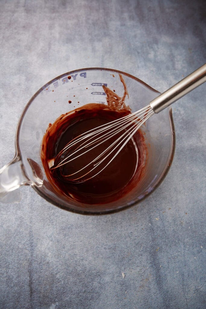 - In a large microwave safe bowl, melt the butter and chocolate on 50% power until the chocolate has just melted, 1 – 1:30 minutes. Whisk until smooth. Cool until it is just warm and not hot. Then whisk in eggs and vanilla.