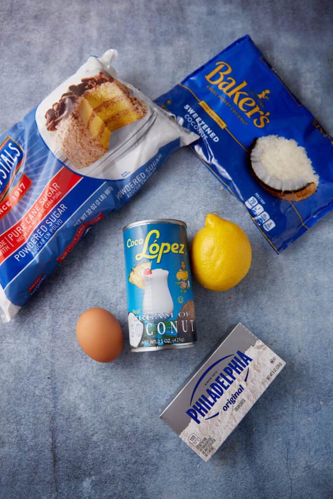 - Coconut filling: You’ll use a blend of sweetened shredded coconut, sweetened cream of coconut, cream cheese, and lemon juice. Make sure you use a block of full-fat cream cheese and not the kind that comes in a tub.