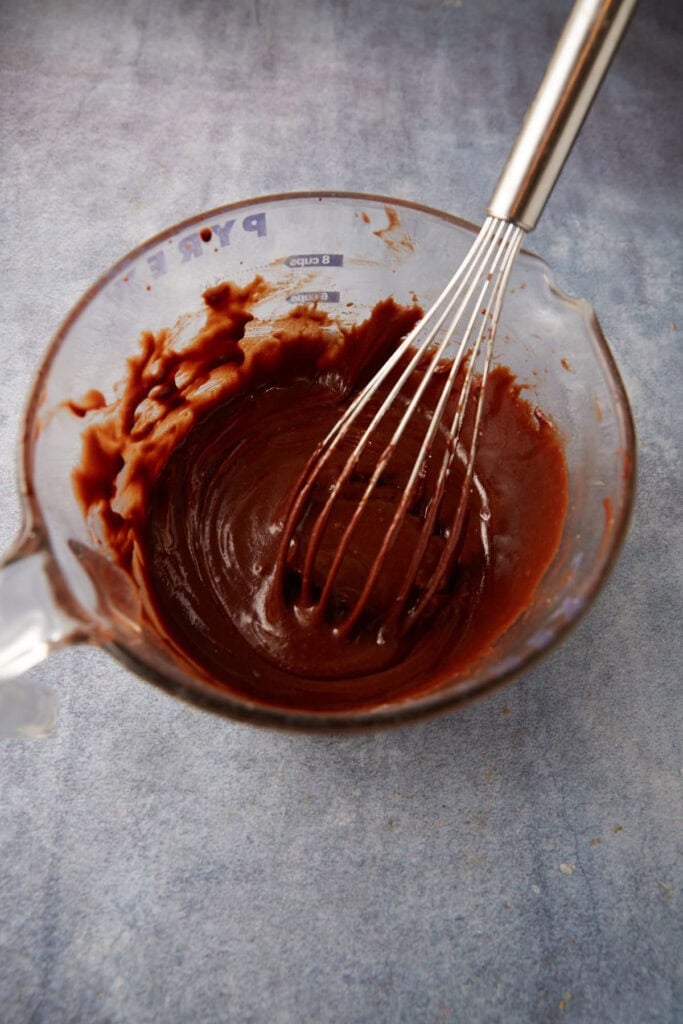 Whisk together the dry ingredients (sugar, flour, baking powder, salt), then combine with the melted chocolate mixture. The batter will be thick.