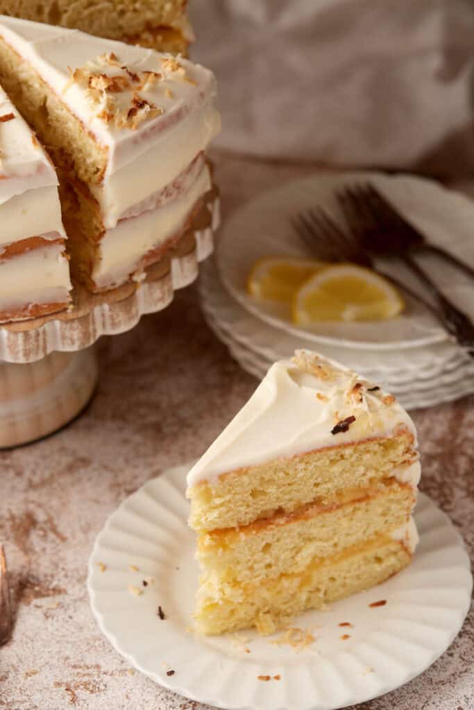 - This is a 3-layer cake. It works best with 3 layers because of the lemon curd. With only 2 layers, you can’t use as much lemon curd, or the layers will slide apart. With 3 layers, you can make a thinner layer, and it will stay together. Sprinkling a little coconut on top of the lemon curd layer adds coconut flavor but also helps it stick to the top layer better.