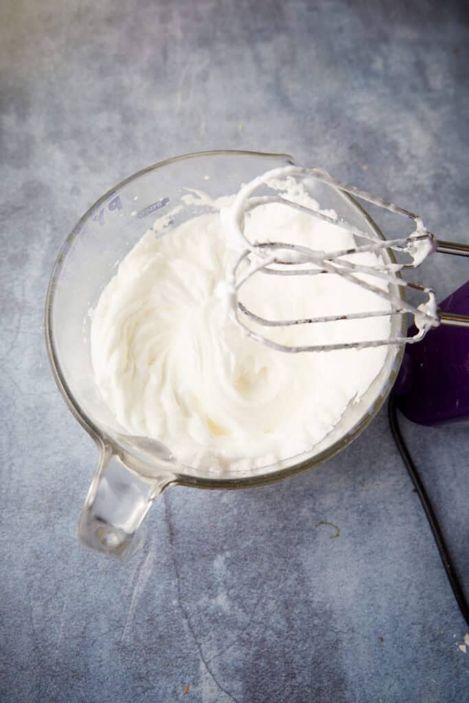 - In a separate bowl, beat the egg whites with a hand mixer until soft peaks form, about 3 minutes. Fold in ¼ of the egg whites, when combined, fold in the remaining egg whites.