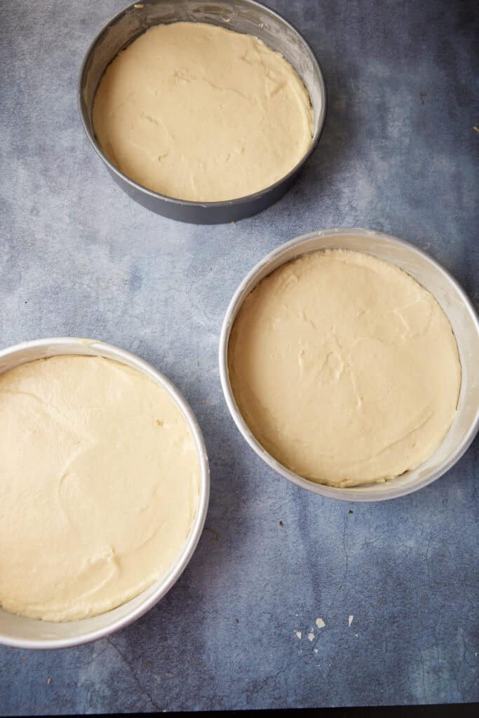 - Preheat oven to 325º. Butter and flour three 9 inch cake pans and line with parchment paper.