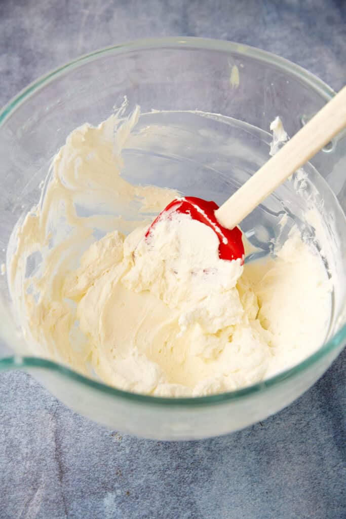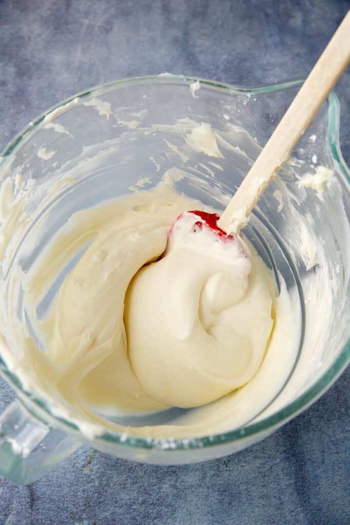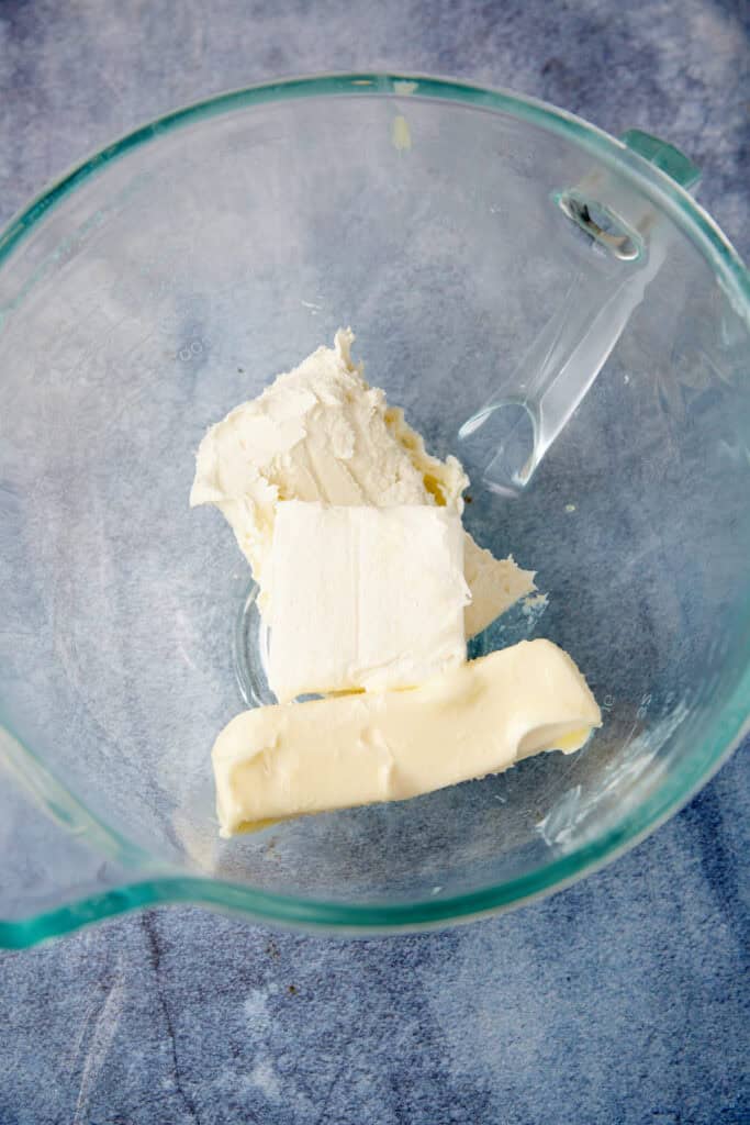 - Cream the butter and cream cheese together until combined with an electric mixer. Add powdered sugar and salt and beat until smooth and creamy. If it is too thin, add more powdered sugar a little at a time. If it is too thick, you can add a little cream.