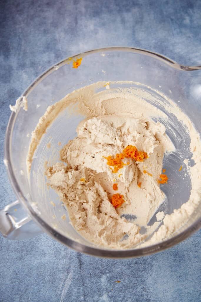 - With an electric mixer, combine butter and sugars and beat until creamy. Add vanilla and orange zest and egg and mix. Add oil and mix until combined.