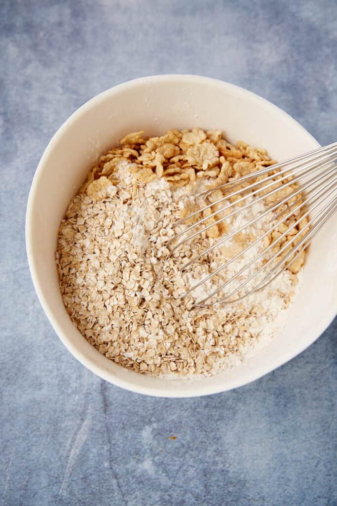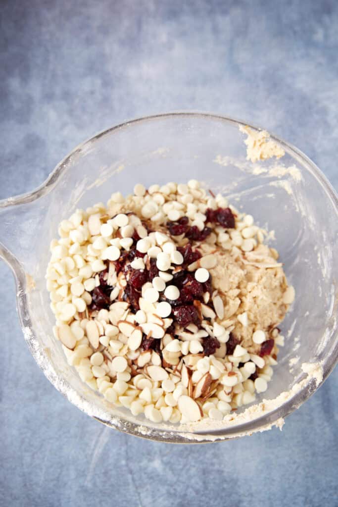 - In a separate bowl, whisk together flour, baking soda and salt. Stir in the oats and cereal. Add to the batter mixing on low until combined. Stir in white chocolate, almonds and cranberries.