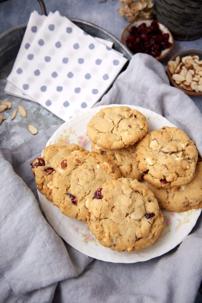 The dough itself is simple and quick to mix. A combination of butter and oil keeps the cookies crisp instead of soft, while orange zest and dried cranberries add a bright, slightly tart flavor. Toss in white chocolate and slivered almonds, and you’ve got just enough sweetness and texture to make these stand out from the usual oatmeal cookie.
