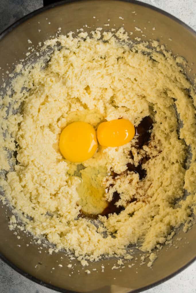 - With an electric mixer, cream the butter and sugar until light, about 2 minutes. Add egg, egg yolk and vanilla and mix until well combined.