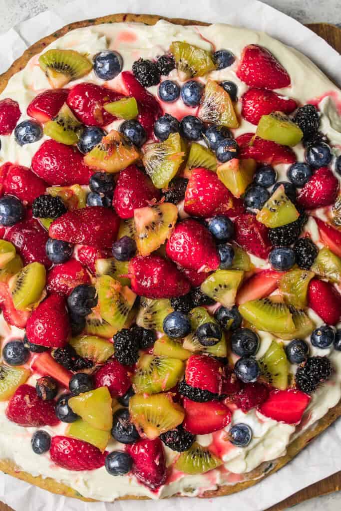 This fruit pizza starts with a homemade sugar cookie dough shaped into a crust. You’ll bake the crust in the oven before adding the toppings, so everything is nice and sturdy. It’s similar to the dough I use for frosted sprinkle cookies.