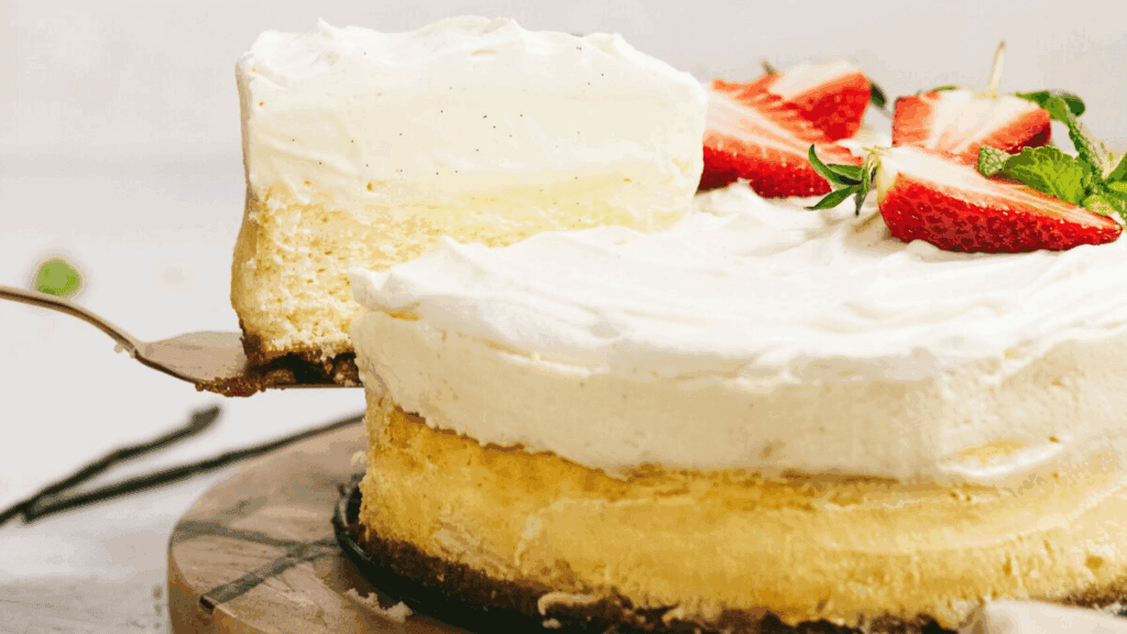 Cheesecake Factory Vanilla Bean Cheesecake is layers of vanilla bean cheesecake, white chocolate mousse and homemade whipped cream.