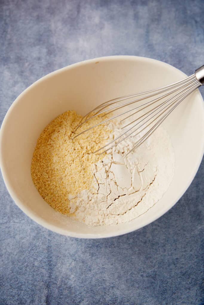 - In a medium bowl, whisk together the flour, cornmeal, soda, salt and cream of tartar. Set aside.