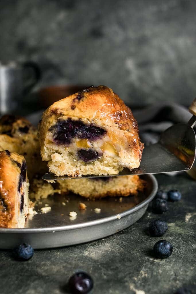 The peaches get tossed with lemon juice before they go in, which keeps their flavor bright as they bake. The batter is thick enough tthat the blueberries don’t sink to the bottom so you get peaches and blueberries in every bite.