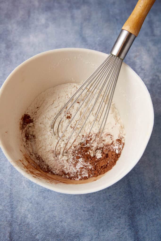 - In a separate bowl whisk together the flour, cocoa powder, baking powder, soda, and salt.