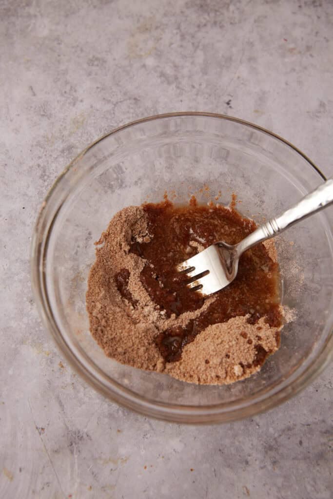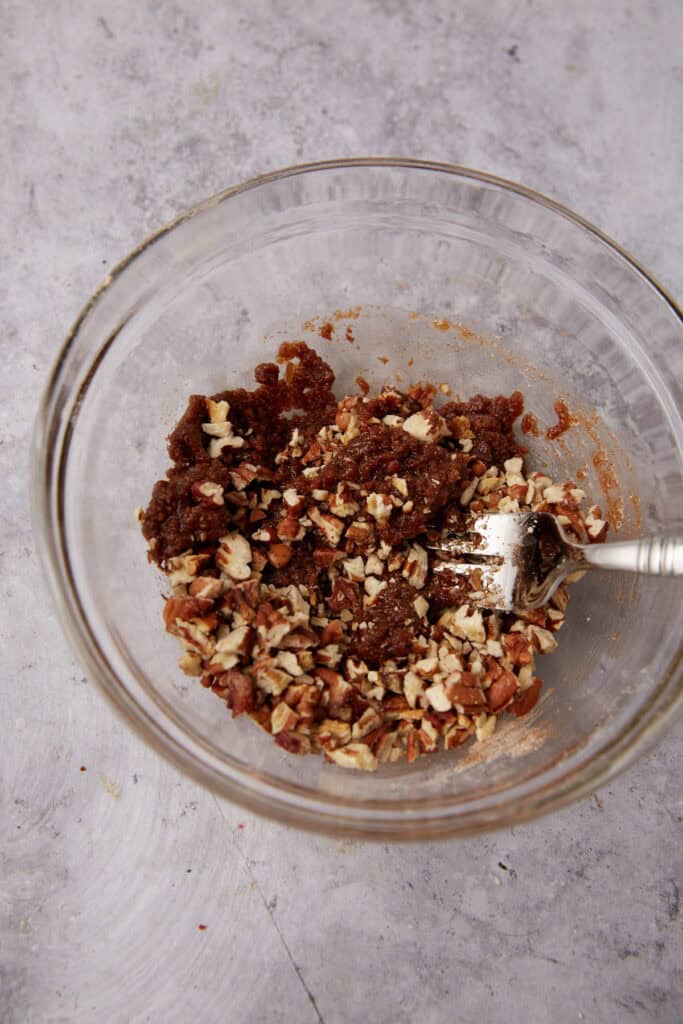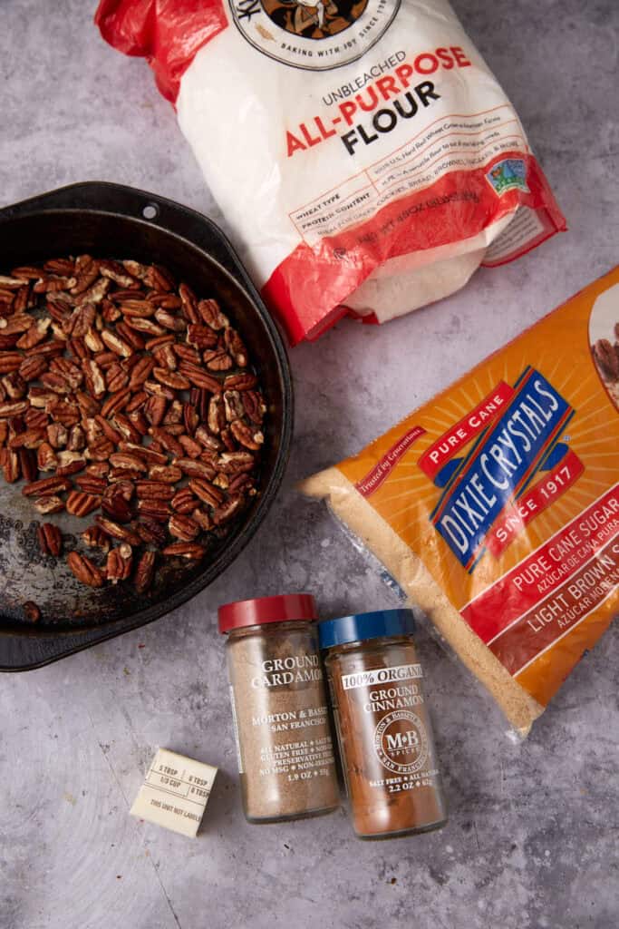- Add the flour, brown sugar, cinnamon, cardamom and salt to a small bowl and mix to combine. Pour melted butter over it and mix with a fork. Add pecans and set aside.