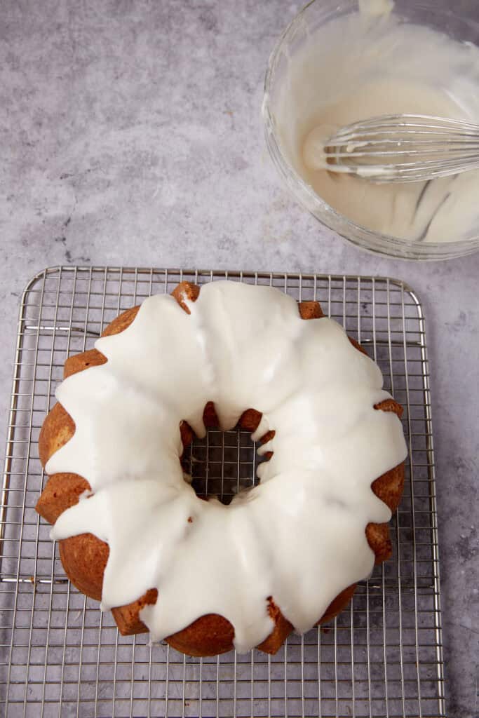 - Whisk the powdered sugar, milk and vanilla until it is smooth and thin enough to drizzle over the cake. Spoon over the cooled cake and let it run down the sides.