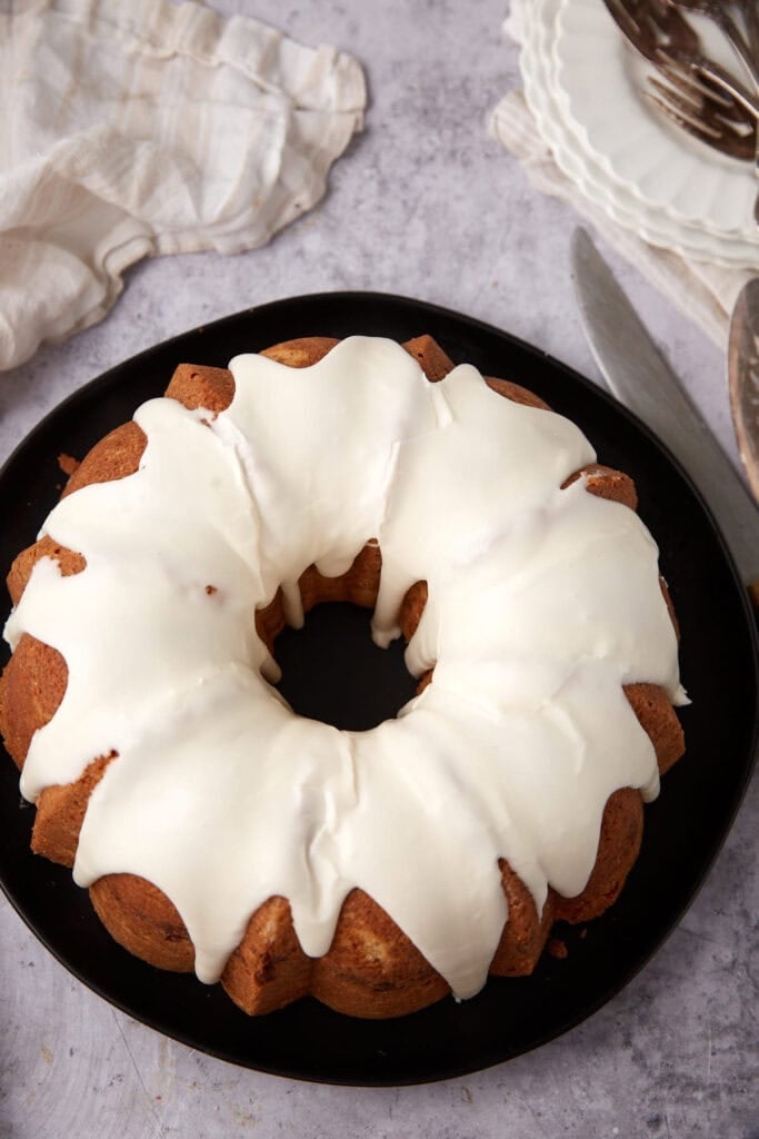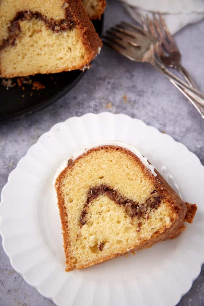 It’s buttery, dense, packed with cinnamon-spiced pecan streusel, and covered in a vanilla glaze that drips into every crevice of the bundt cake.
