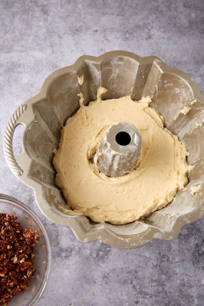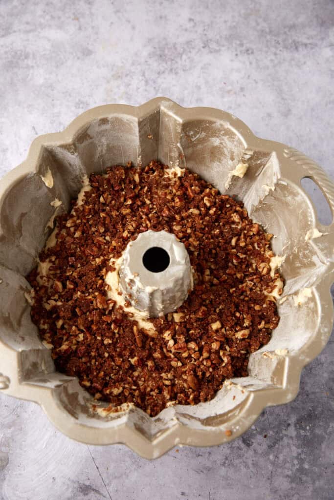 - Spread half of the batter into the bundt pan, cover with the streusel mixture, spreading it out evenly. Spread the remaining batter on top and smooth the surface. Tap the pan on the counter to remove any air bubbles.