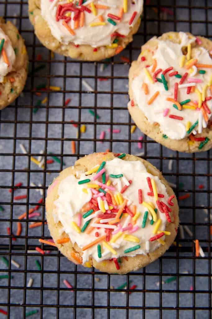 Sprinkle Cookies are thick sprinkle sugar cookies with crisp edges, chewy centers, and optional butter frosting. Cornstarch and cream of tartar give them that classic sugar-cookie chew instead of a flat, sweet butter cookie. These do require some chill time, but they bake in about 10 minutes.