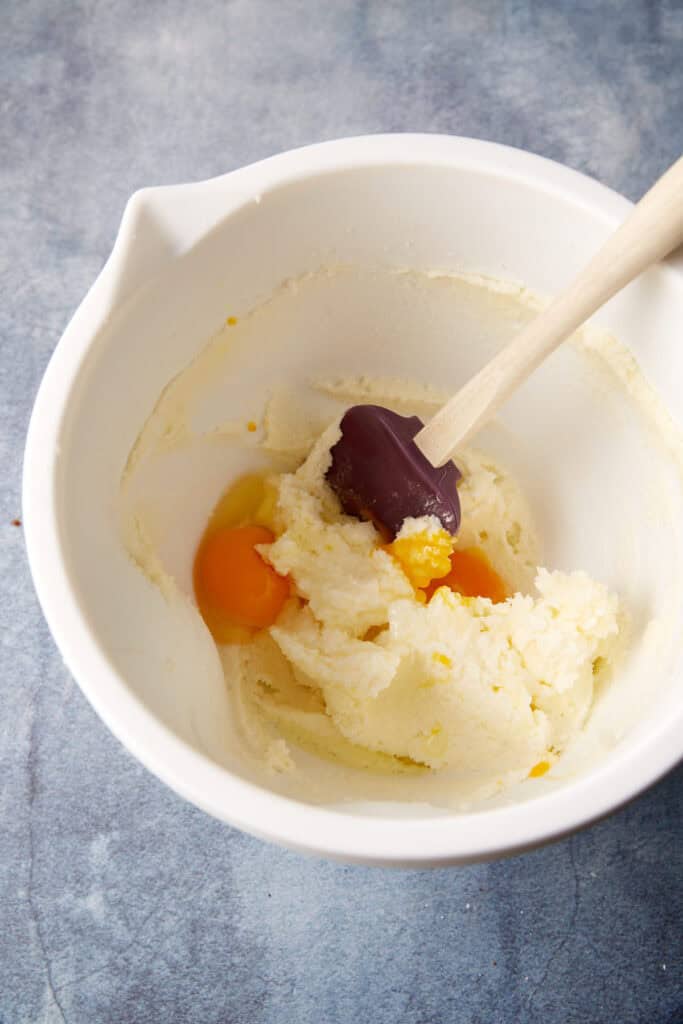 - With an electric mixer, cream the butter and sugar until light and fluffy, about 2-3 minutes. Add egg, egg yolk and vanilla and mix until combined.