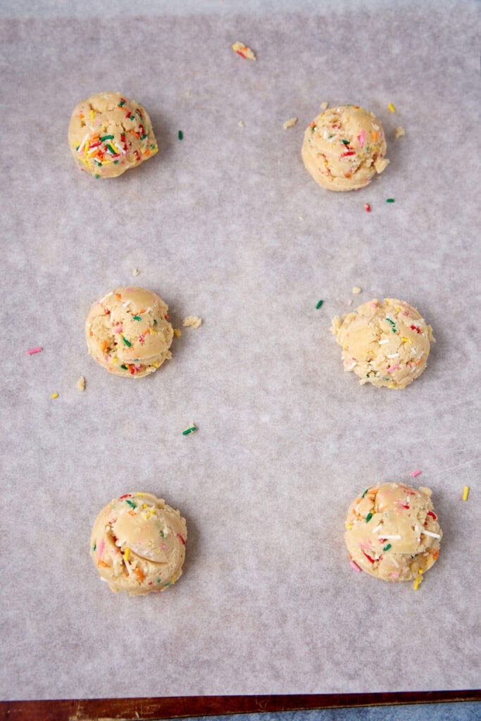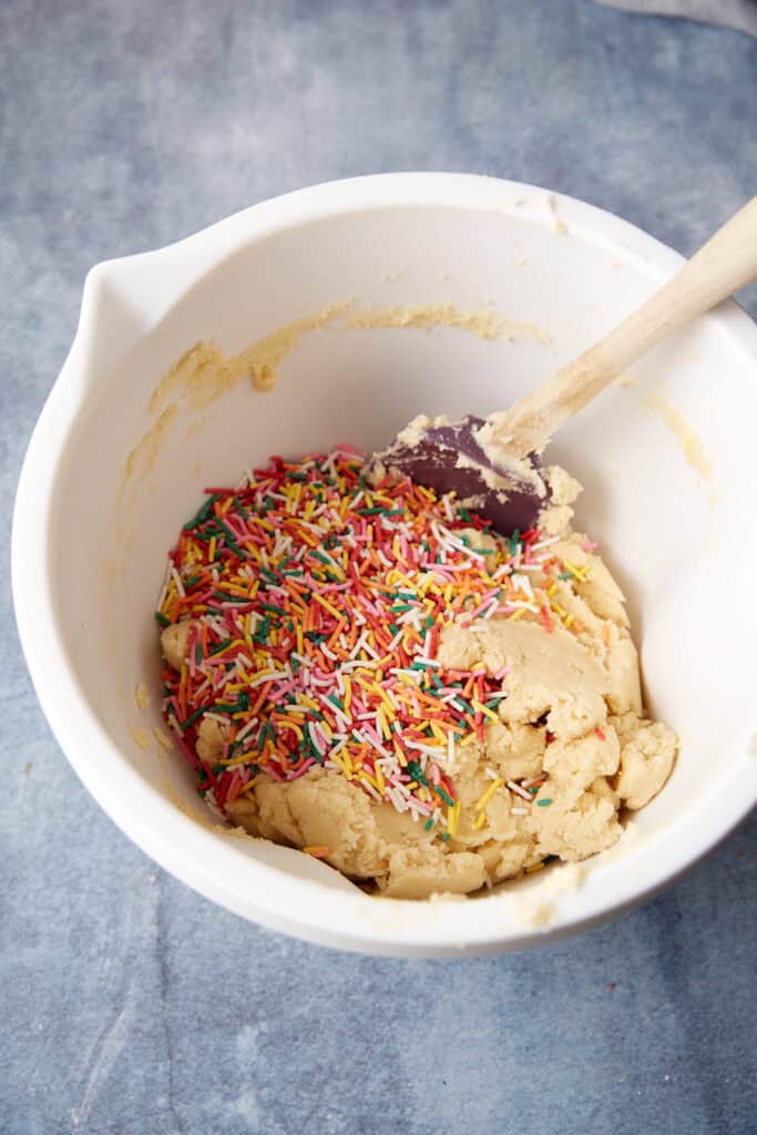 - Sprinkles: Use jimmies in the dough (they hold their shape better). Save nonpareils or sanding sugar for decorating on top if you want a different look. These are the sprinkles I use, nothing fancy.