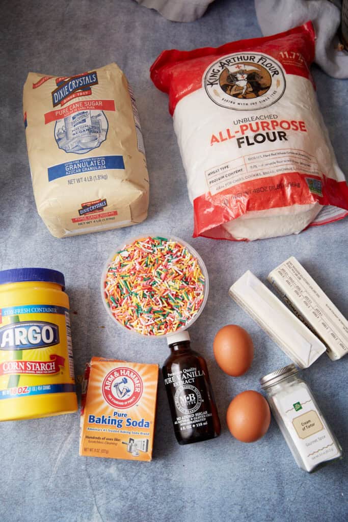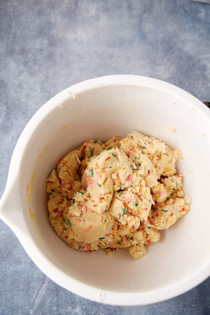 - In a separate bowl, whisk together the flour, baking soda, cream of tartar, cornstarch and salt. Add to the butter mixture on low speed and mix until combined. Gently mix in the sprinkles, just enough to disburse throughout the dough.