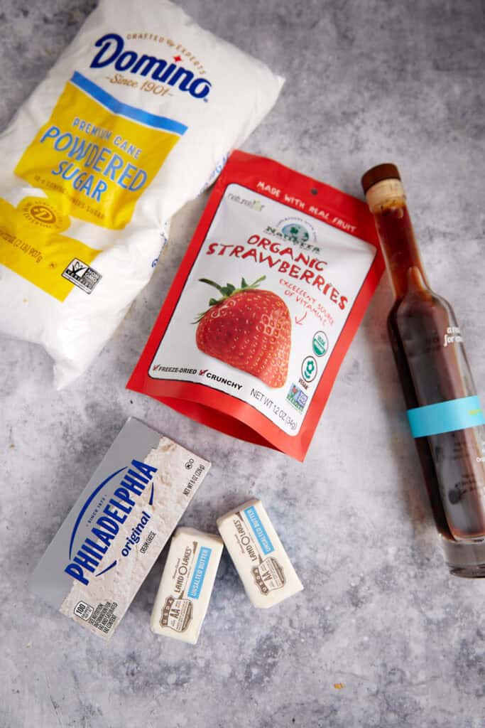 - Freeze-dried strawberries: You can usually find these in the dried fruit section or snack aisle of your grocery store.These are ground to a fine powder and incorporated into the frosting.