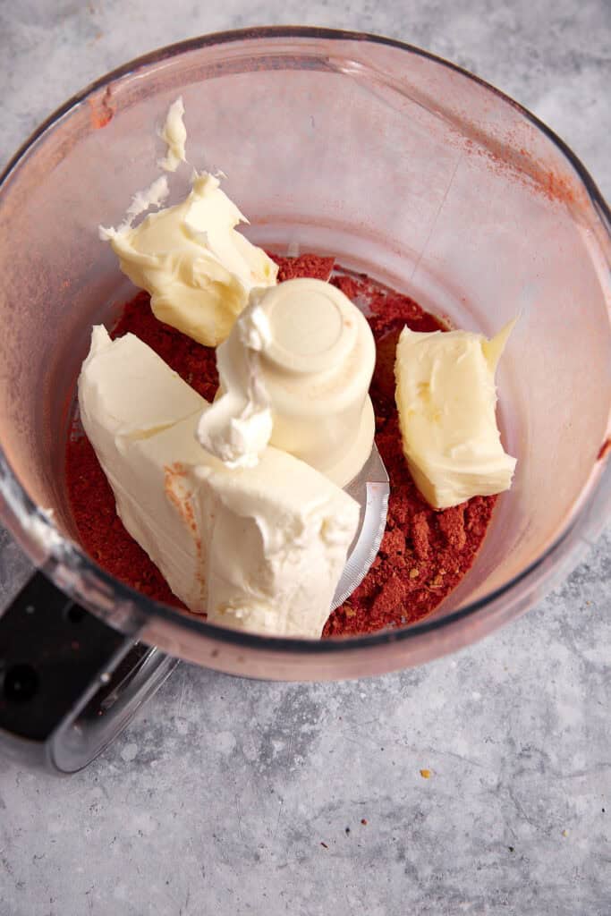 Grind the freeze-dried strawberries into a powder using a food processor, or crush them in a ziplock bag with a rolling pin. Then, mix the cream cheese and butter until smooth and creamy.