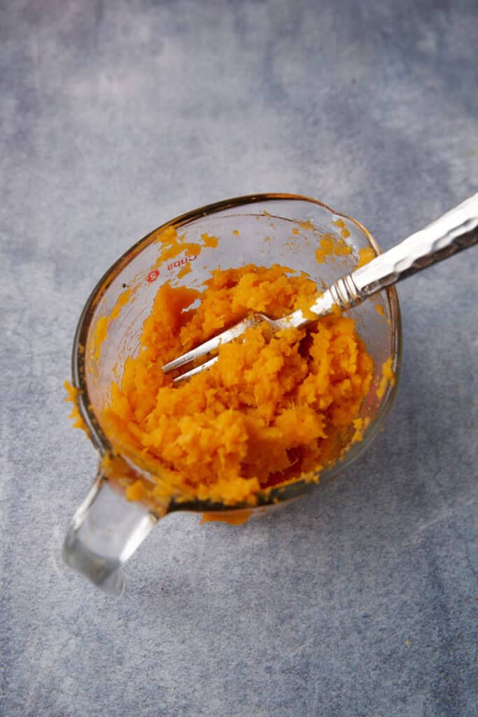 - Microwave sweet potatoes, once cooled, mash the sweet potatoes with a fork and set aside.
