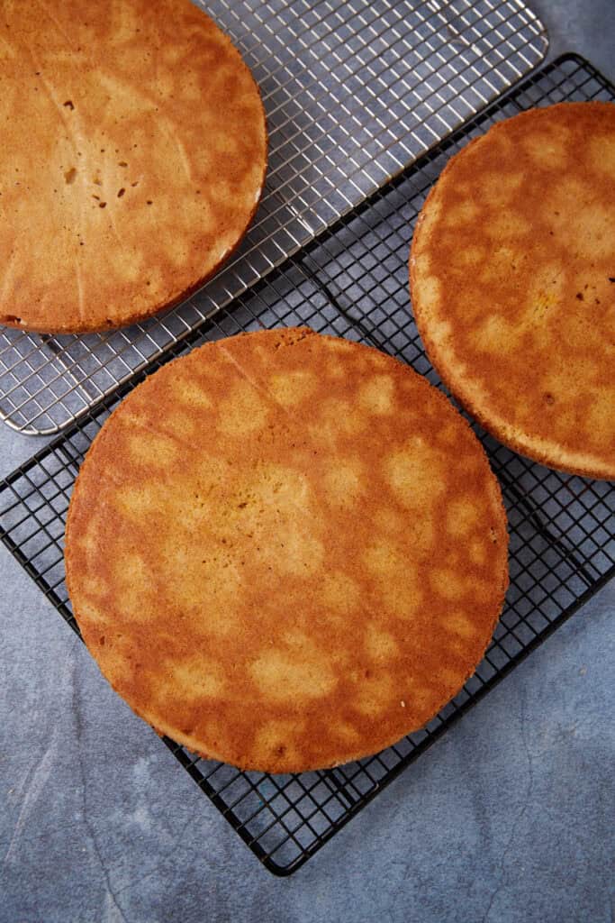 - Place on a wire rack to cool in the pans for 5 minutes. Run an offset spatula or knife around the edges and flip onto a wire rack. Remove the parchment paper and let cool completely before frosting.